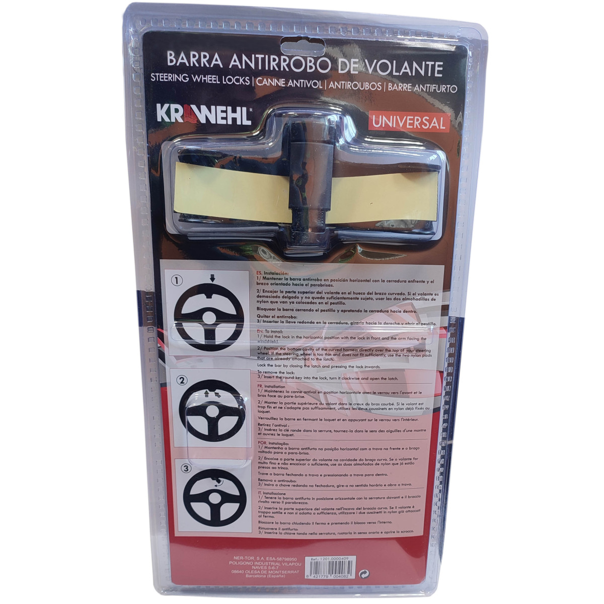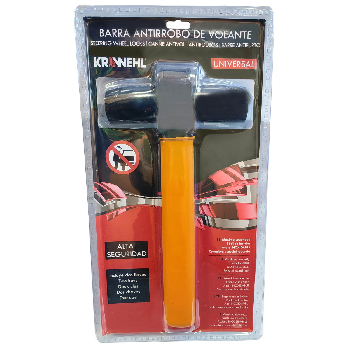 Cet antivol est fabriqué en acier résistant. Il bloque le volant efficacement et garantit ainsi une haute sécurité grâce à sa serrure robuste et les deux clés fournies.