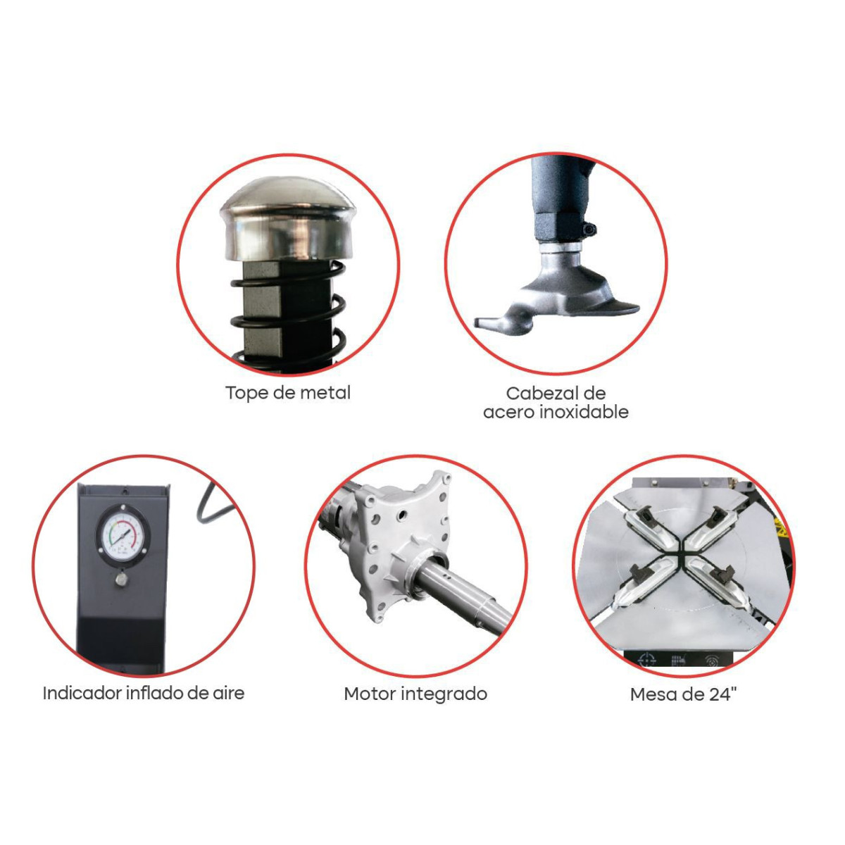 Conçu pour les ateliers professionnels qui recherchent efficacité et sécurité dans le démontage des roues, ce démonte-pneus automatique offre un système de travail robuste et fiable. Sa fonction d'auto-centrage facilite le positionnement précis du pneu, tandis que le système de serrage avec fonction de pas assure un serrage ferme et adaptable. La colonne inclinable à verrouillage pneumatique permet une manipulation agile et sûre, optimisant le temps passé dans l'atelier. Équipée d'unebutée métallique, d'une tête en acier inoxydable et d'un indicateur de gonflage pratique, cette machine allie durabilité et fonctionnalité. Son moteur intégré et la grande table de travail de 26'' complètent une machine prête à affronter un usage quotidien intensif, répondant aux normes requises par la certification CE.