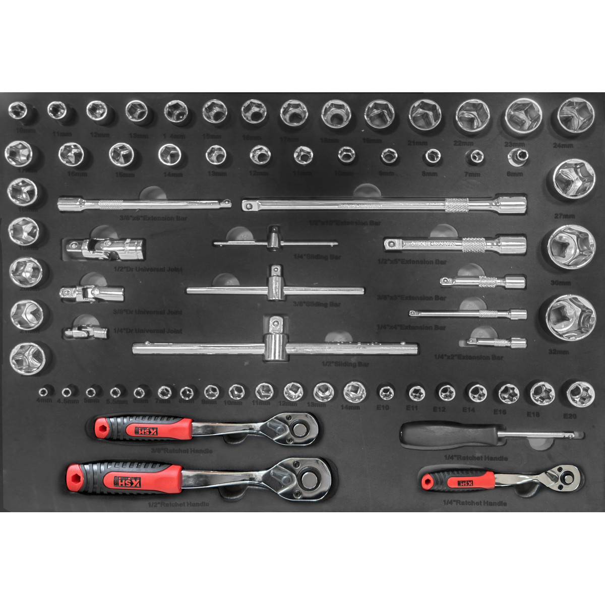 3/8" : Cliquet, douilles métriques (6 à 22 mm) et Torx externes (E10 à E20), extensions de 3" et 6", barre rotative et articulation universelle.