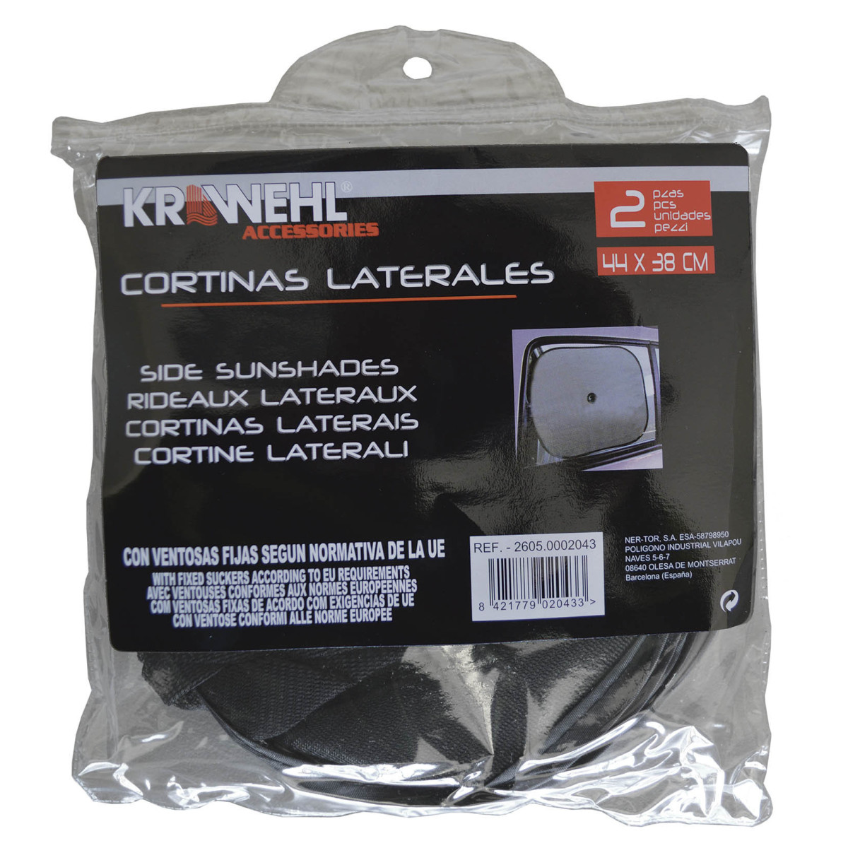 Protect passengers and pets from the effects of the sun, provide a cooler interior temperature, as well as prevent overheating when car is parked. High protection to prevent the upholstery and dashboard from cracking and losing their original color. Very easy to use. Thanks to its suckers, the side sunshade can be fixed to any type of window in a few seconds. Secure fixing. Its universal size is compatible with most cars. Easily folded up and can be stowed under the seat. Suckers on the Krawehl sunshades comply with EU safety regulations. Size: 44 cm x 38 cm. Presented in a transparent hanging plastic bag, which contains 2 pcs.