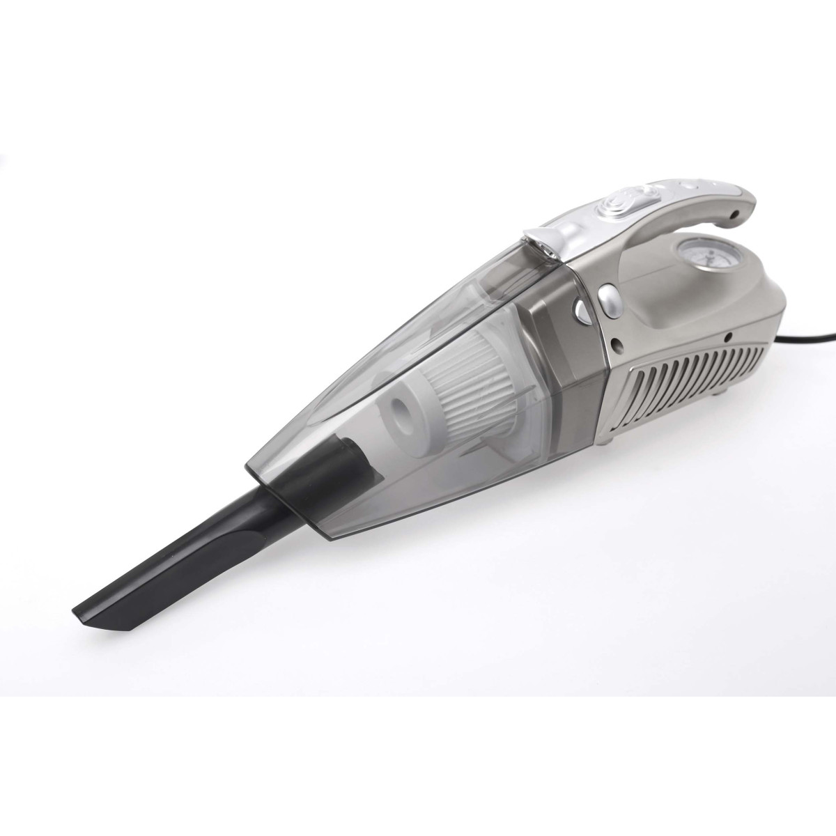 Multi-function vacuum cleaner ideal for use in the vehicle: portable vacuum cleaner + air compressor for tire inflation, 150 PSI with Manometer + led Flashlight.