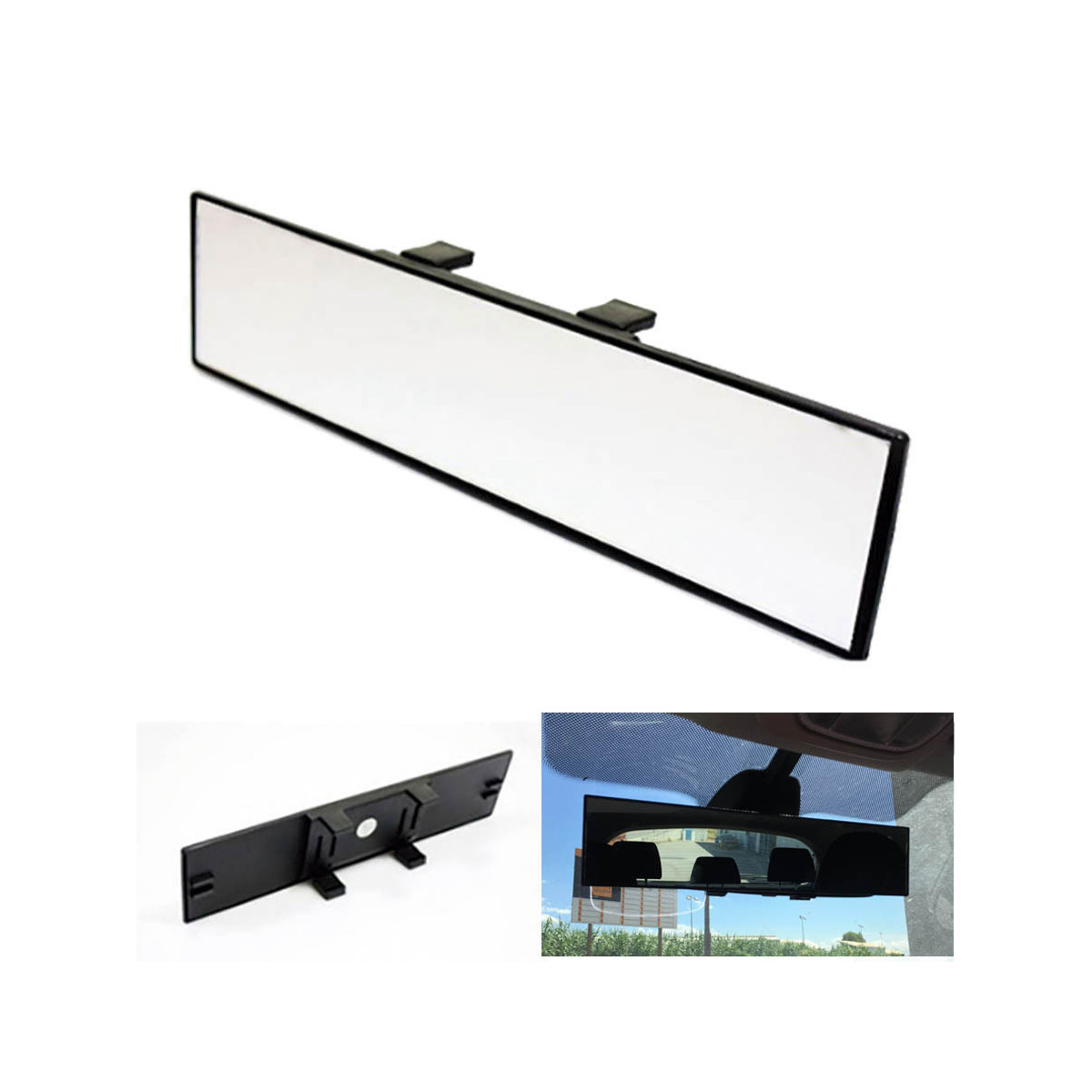 Flat rear view mirror with panoramic view.