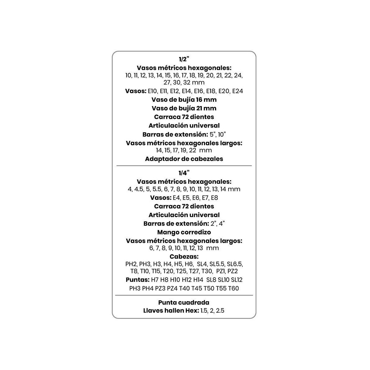 - Metric hex sockets: 4, 4.5, 5, 5.5, 5.5, 6, 7, 8, 9, 10, 11, 12, 13, 14 mm