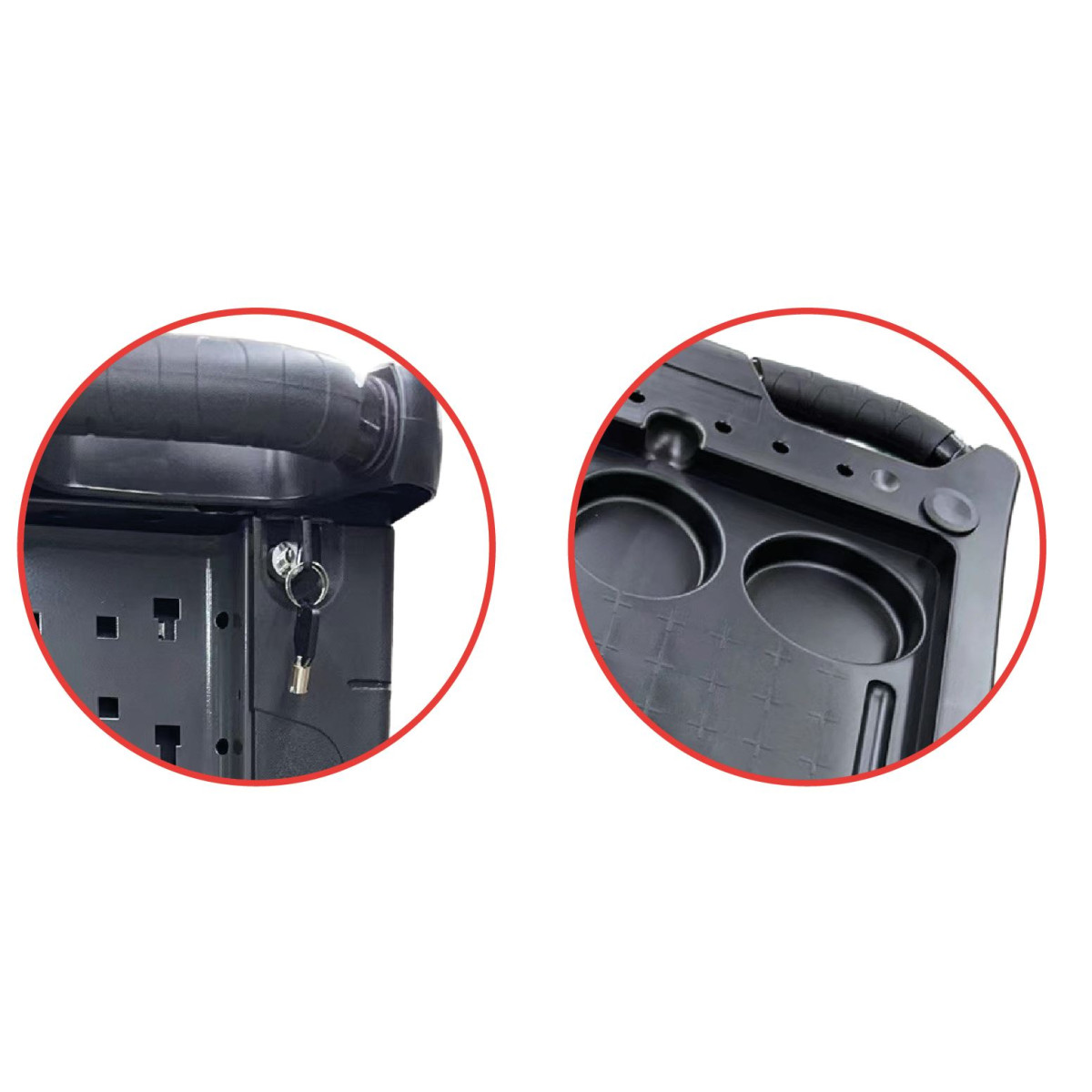 Professional trolley with 7 cushioned return drawers, perforated side panel and central locking system. Its sturdy structure allows customised organisation of tools, ensuring safe mobility and accessibility in any working environment.