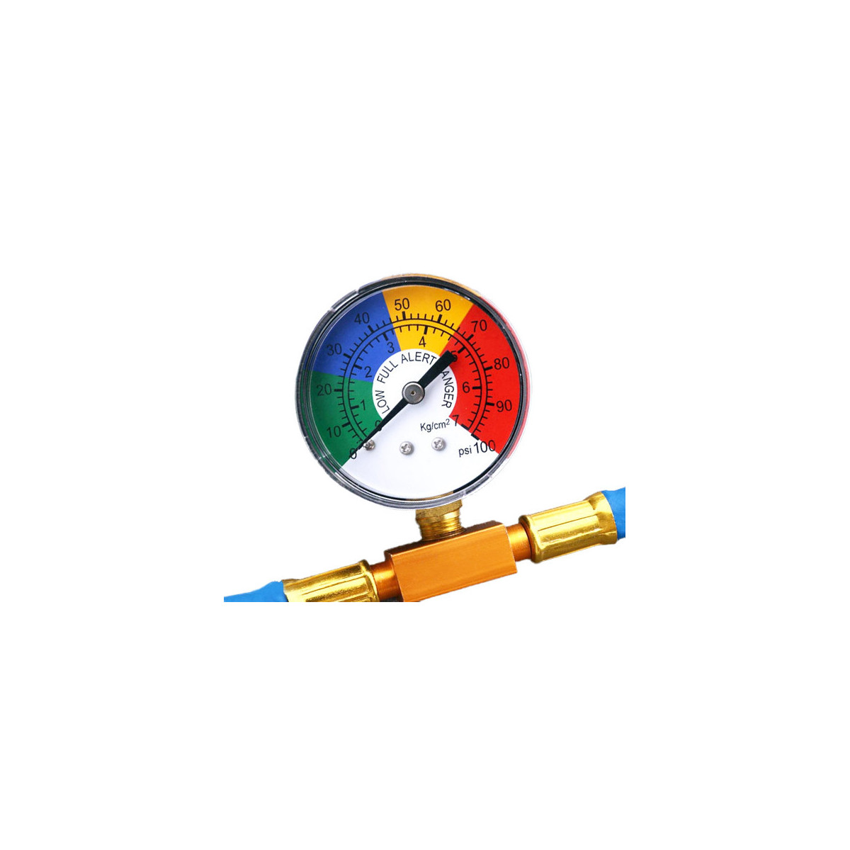 The air conditioning charging hose is an essential tool for safe and accurate recharging of systems using R134A refrigerant. Equipped with a 5 cm diameter pressure gauge, it allows a clear and quick reading during the process, facilitating more efficient and safer work. Its compact and functional design, coupled with premium materials, ensures exceptional durability and reliable performance in demanding workshop conditions. Ideal for professionals in the industry, this hose stands out for its precision, ease of use and strength, making it an indispensable component for HVAC maintenance.