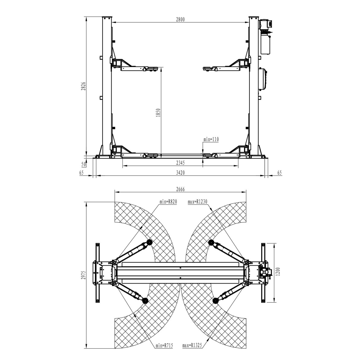 - Largura útil entre colunas: 2345 mm.